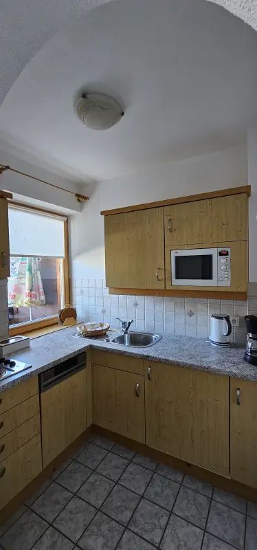 Küche mit Aussicht, schönem Essplatz für 4-5 Pers., E-Herd, Backrohr, Dunstabzug, Kühlschrank, Geschirrspüler, Kaffeemaschine, Wasserkocher,Toaster, Ess- und Kochgeschirr