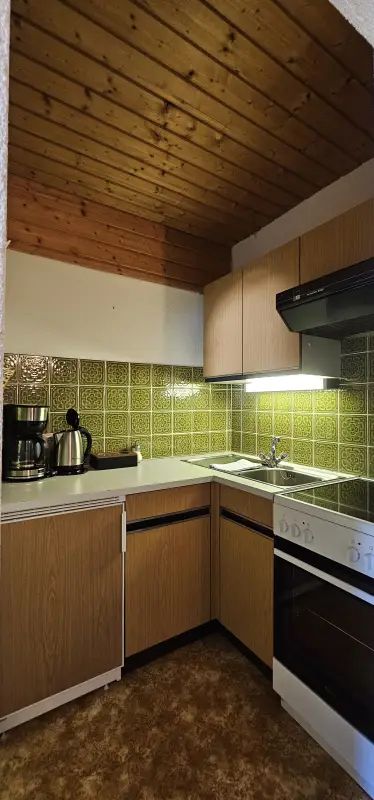 Kleine Küche mit E-Herd, Backrohr, Kühlschrank, Kaffeemaschine, Wasserkocher, Toaster, Ess- und Kochgeschirr